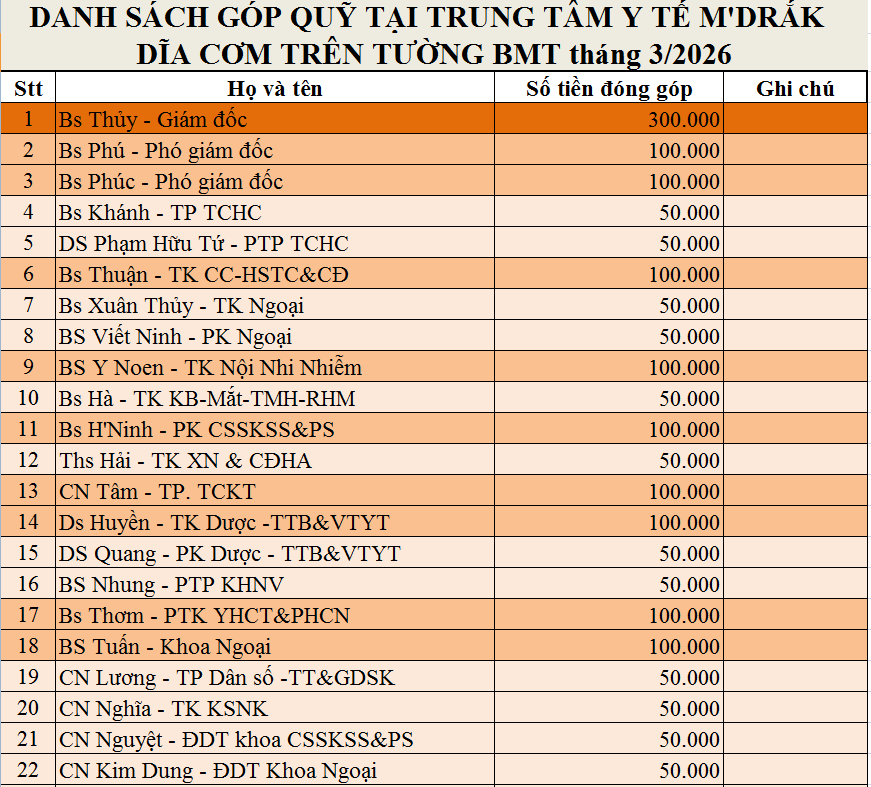 Danh sách ủng hộ “Dĩa cơm trên tường BMT” tháng 3 năm 2026 của TTYT M’Drăk 30 Tháng 3, 202630 Tháng 3, 2026 Bởi Võ Thanh Tâm